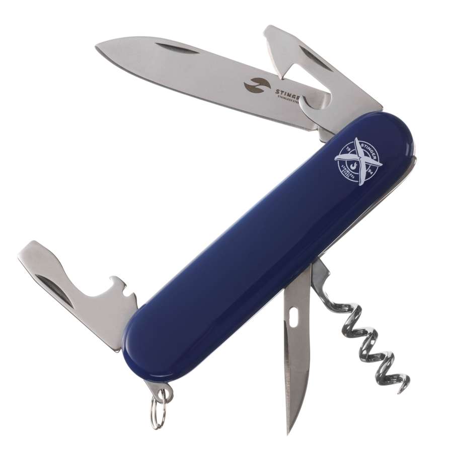 Нож перочинный Stinger, 90 мм, 10 функций, лезвие и инструменты из нержавеющей стали 420, 44-48HRC, рукоять из синего АБС-пластика, в блистере