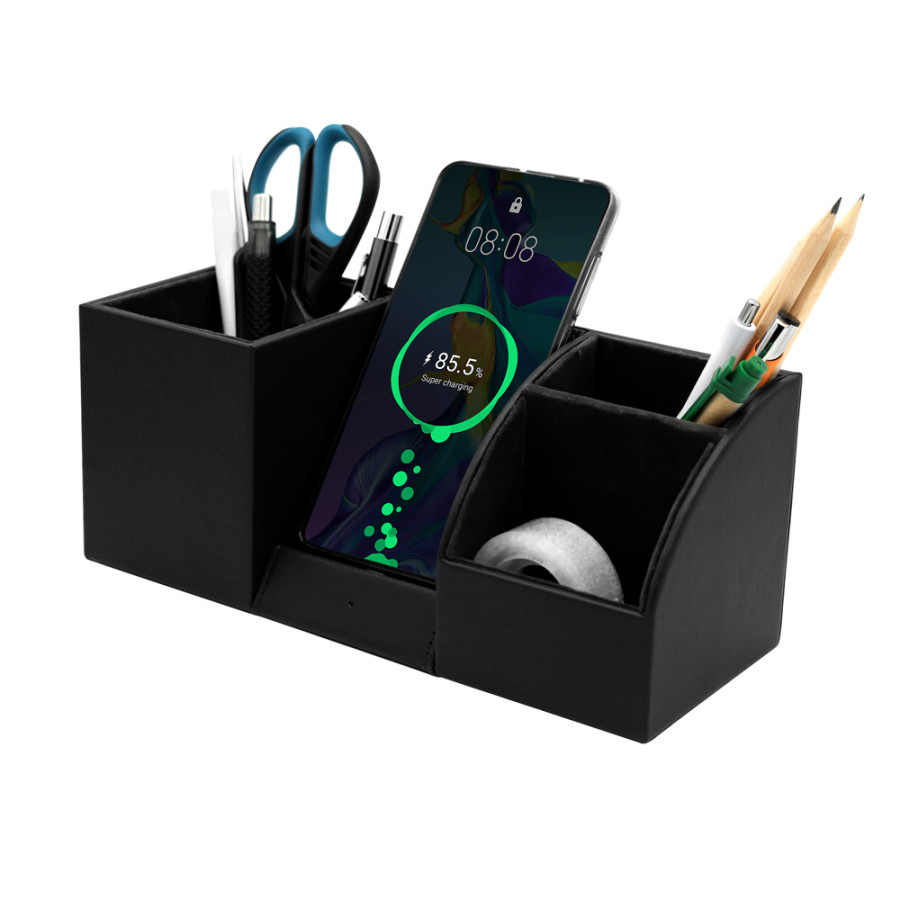 Настольный органайзер Boss c беспроводной зарядкой и световым индикатором. Для работы или дома, сочетающий в себе подставку для канцелярских принадлежностей и мелких аксессуаров. Вход: 9V/1. 67A/5V/2A USB 2. 0. Выход: Беспроводная зарядка 10W. В комплекте кабель USB и инструкция.