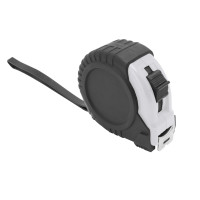 Рулетка / флексометр длиной 5 м с блокирующим механизмом и металлическим крючком для ленты. Корпус из цветной резины, металлическая клипса и ремень для переноски.