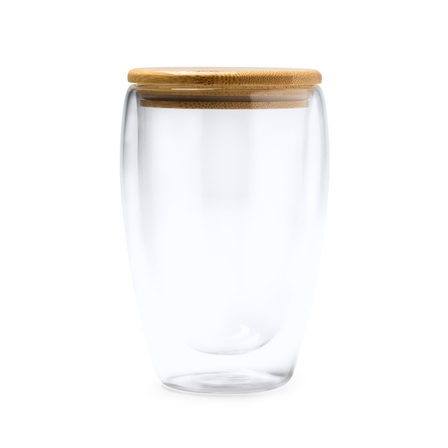 Двустенный стакан из боросиликатного стекла с бамбуковой крышкой. Идеально подходит для подарков и сюрпризов вашим клиентам. Емкость 350 мл.