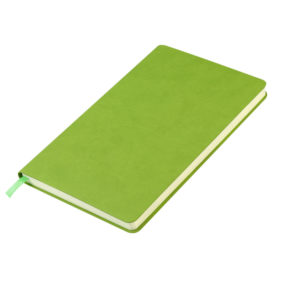 Блокнот формата А5 с мягкой обложкой из PU-материала, имеющего текстуру, имитирующую поверхность натуральной кожи; с текстильной закладкой в цвет блокнота, 256 страниц, плотность 70г/м, страницы с черными линиями. Цвет по PANTONE® (максимально приближен): 2276C.