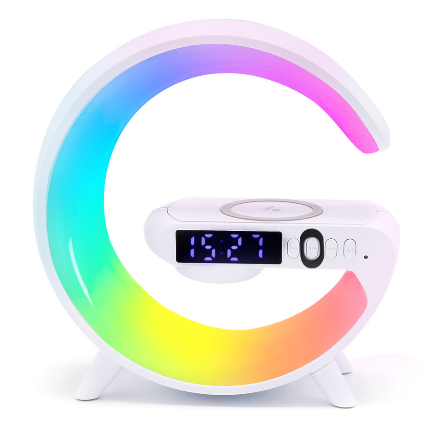 Беспроводная колонка с функцией беспроводной зарядки. Часы, будильник, RGB-подсветка, а так же защитная накладка на кнопке включения являются её особенностями. При остаточном заряде 10-20% подаётся предупреждающий сигнал. Размер: 155*55*160мм Bluetooth: v 5. 2 Мощность динамика: 3W Батарея: 3. 7V / 300 мА·ч Время работы: 2-3 Часа Время зарядки: 2, 5 Часа Порт зарядки: Type-C Входное напряжение и ток: 5V/2A Беспроводное зарядное выход: 5W.