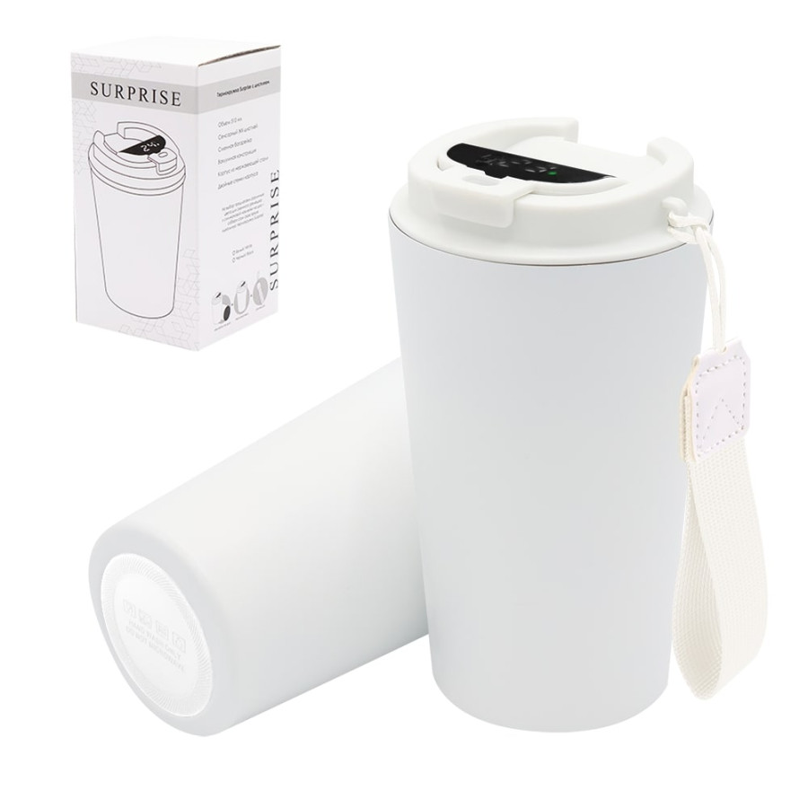 Термокружка Surprise To Go с дисплеем выполнена из пищевой нержавеющей стали. Имеет двойные стенки с вакуумной изоляцией, а крышка изготовлена из пищевого безопасного для человека пластика. Термокружка Surprise To Go не только сохраняет ваши напитки горячими, но и показывает температуру напитка! Уникальная особенность данной термокружки – наличие сенсорного индикатора температуры, расположенного в крышке. Чтобы узнать температуру напитка внутри кружки, достаточно прикоснуться к поверхности крышки. Работает от 1 батарейки типа CR2032 (в комплекте), которую в последующем можно самостоятельно заменить.