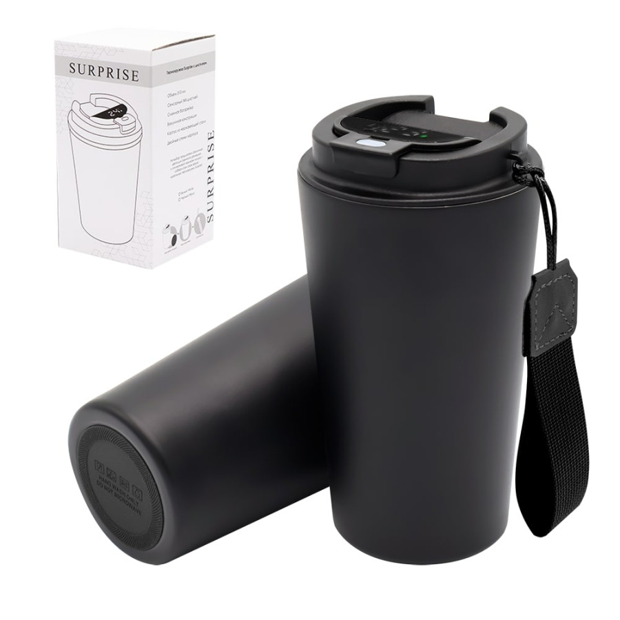 Термокружка Surprise To Go с дисплеем выполнена из пищевой нержавеющей стали. Имеет двойные стенки с вакуумной изоляцией, а крышка изготовлена из пищевого безопасного для человека пластика. Термокружка Surprise To Go не только сохраняет ваши напитки горячими, но и показывает температуру напитка! Уникальная особенность данной термокружки – наличие сенсорного индикатора температуры, расположенного в крышке. Чтобы узнать температуру напитка внутри кружки, достаточно прикоснуться к поверхности крышки. Работает от 1 батарейки типа CR2032 (в комплекте), которую в последующем можно самостоятельно заменить.
