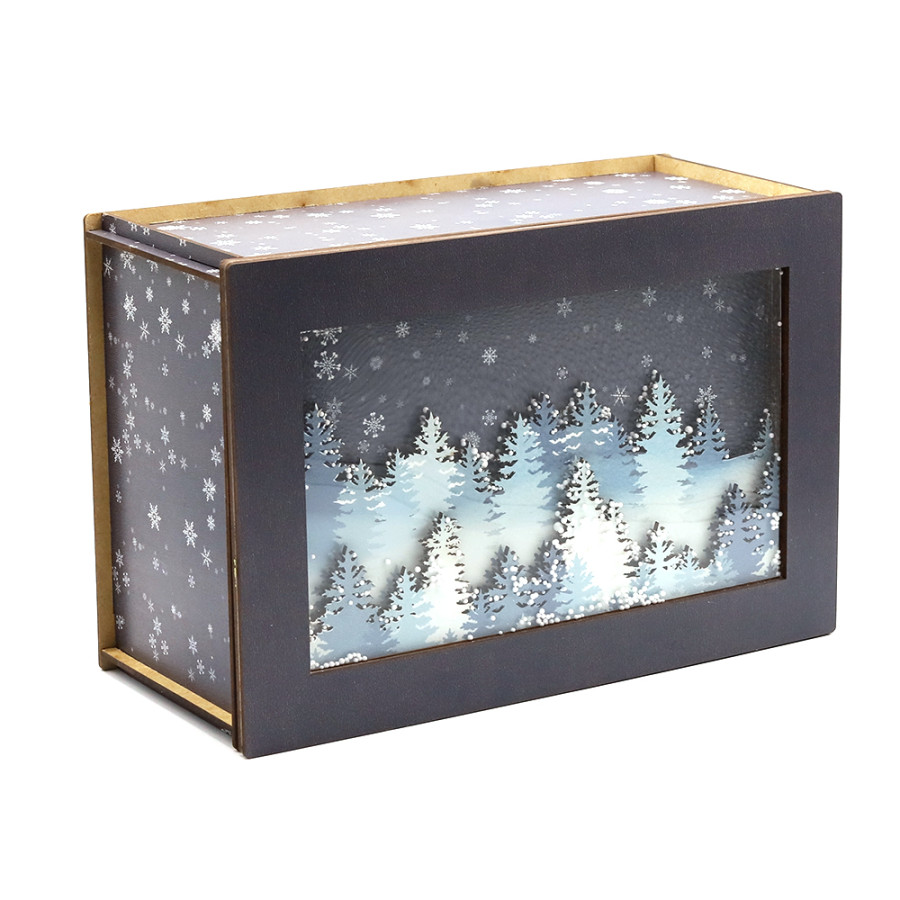Лес в снегу (прямоугольная, темная) - упаковка новогодняя из дерева