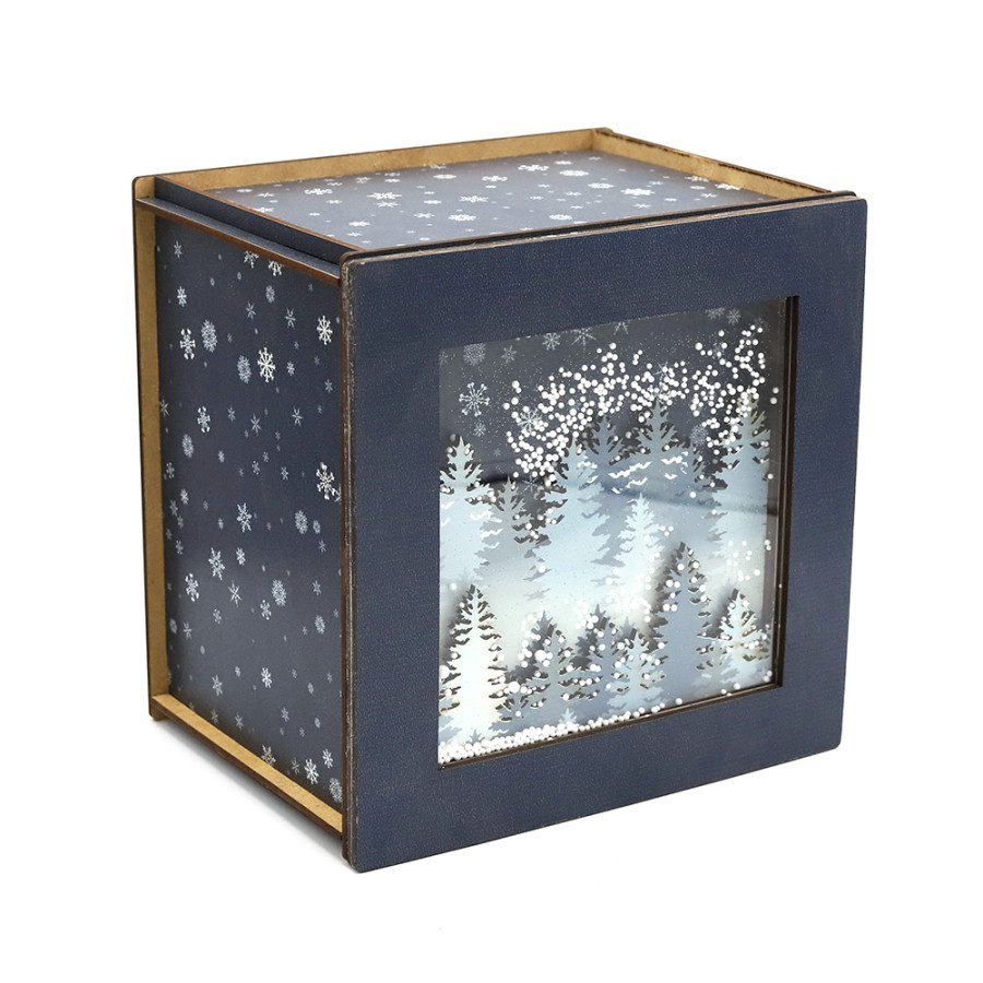 Лес в снегу (квадратная, темная) - упаковка новогодняя из дерева