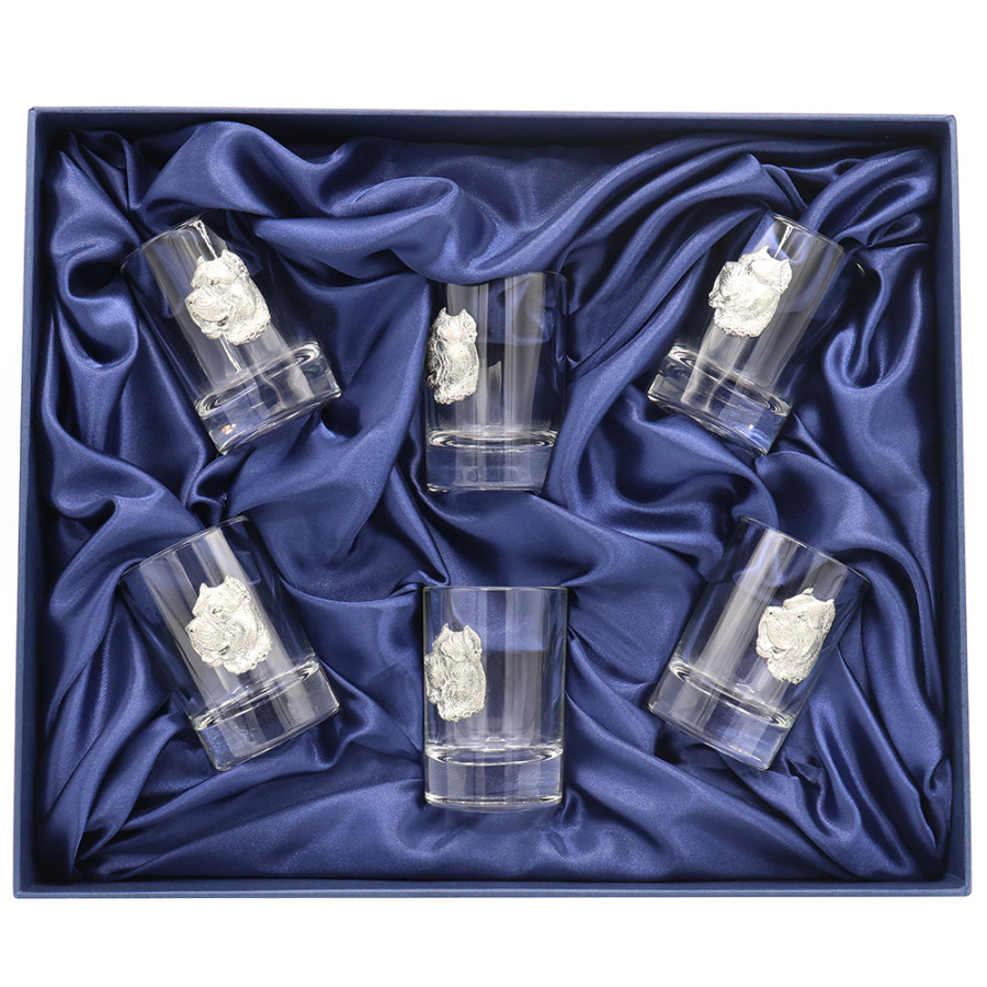 Шесть стопок объемом 50 мл каждая, украшенных литыми оловянными барельефами с изображением «Друг человека». Барельефы выполнены из сплава олова, что обеспечивает их прочность и качество.