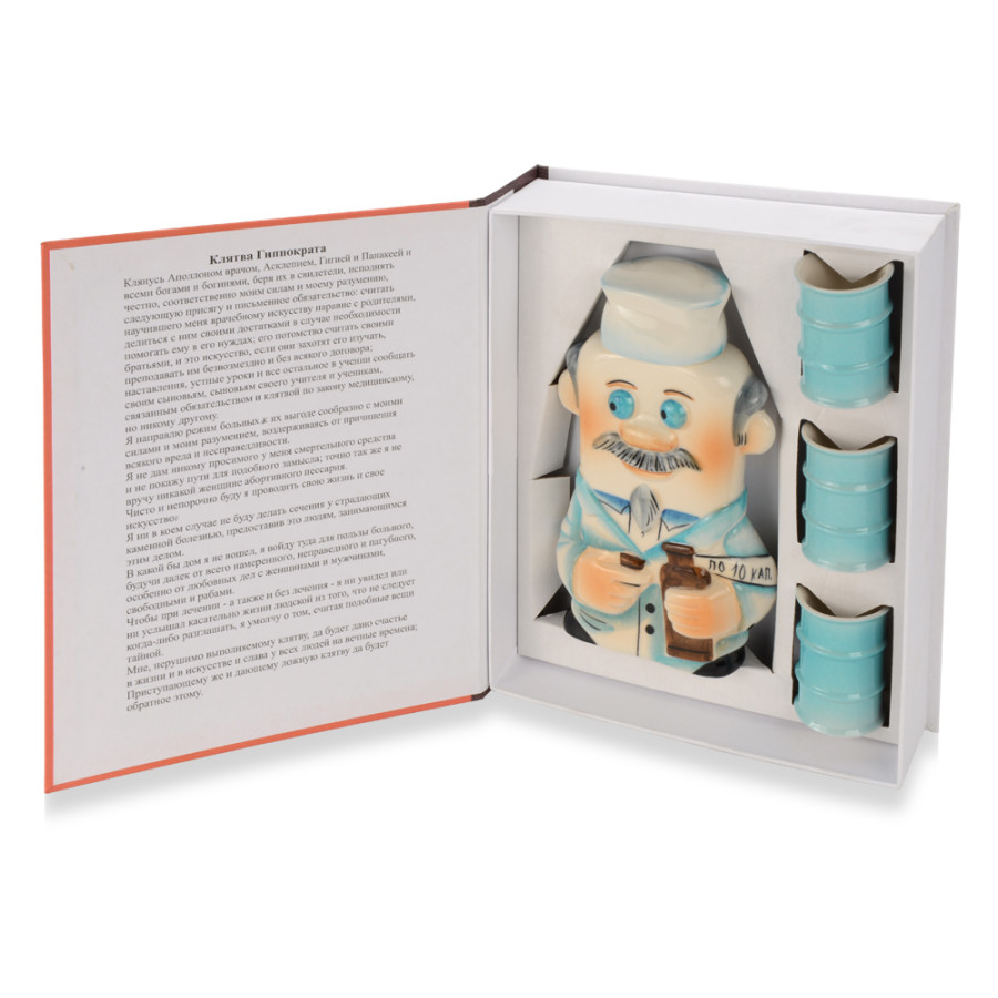 Настольная книга врача — это изящный и оригинальный фарфоровый набор, выполненный в виде книги. В комплект входят штоф и рюмочки, украшенные тематическими изображениями и деталями, связанными с медициной и врачебной практикой. Такой набор станет стильным украшением стола и отличным подарком для медицинских работников, студентов или любителей медицины. Штоф удобно использовать для хранения напитков, а рюмочки — для подачи любимых напитков в торжественной обстановке. Этот набор в виде книги подчеркнет профессиональную тематику и создаст особую атмосферу уюта и уважения к профессии врача.