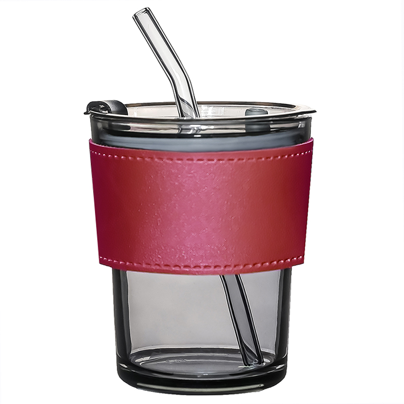 Стакан стеклянный с трубочкой и капхолдером Karamel, бордовый