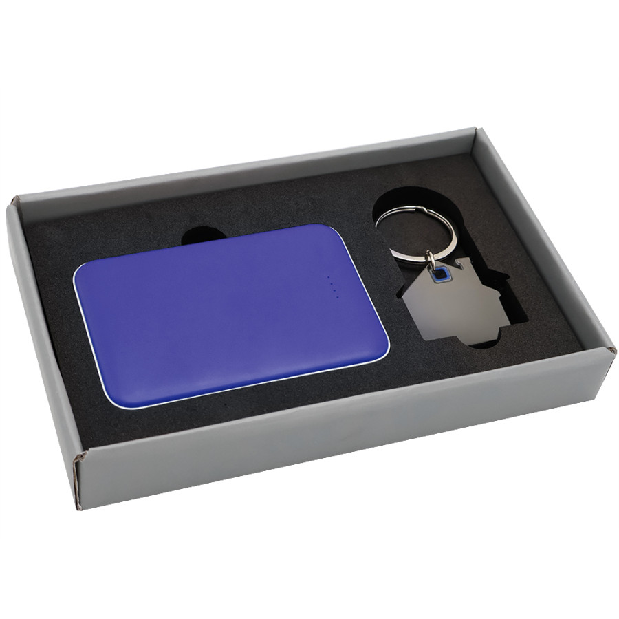 Подарочный набор в элегантной цветной картонной коробке серого цвета с конструкцией крышка-дно. Внутри расположены аккуратно закрепленные на ложементе внешний аккумулятор емкостью 5000 мА·ч и металлический карманный брелок. Внешний аккумулятор обладает компактным дизайном и обеспечивает надежный запас энергии для мобильных устройств в пути, а стильный металлический брелок станет практичным и эстетичным аксессуаром для ключей. Этот набор идеально подходит в качестве презента для тех, кто ценит удобство, качество и современный стиль.
