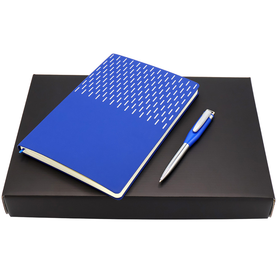 Подарочный набор в стильной цветной картонной коробке черного цвета (крышкой-дно). Внутри на аккуратном ложементе располагаются ежедневник А5 и элегантная металлическая ручка - флешка емкостью 64 ГБ.
