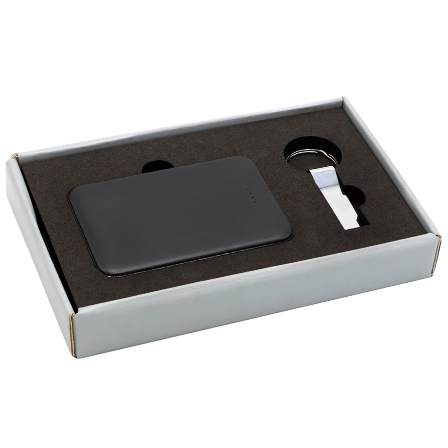 Подарочный набор в стильной цветной картонной коробке серого цвета (крышкой-дно). Внутри на аккуратном ложементе располагаются внешний аккумулятор емкостью 5 000 мА·ч и элегантная флэшка емкостью 16 ГБ в прочном металлическом корпусе. Мощный аккумулятор обеспечивает быстрое и надежное подзаряжание мобильных устройств в любых условиях, а флэшка сочетает вместительность и изысканный дизайн, надежно защищая ваши данные. Этот комплект станет отличным подарком для современных и активных людей, ценящих качество, функциональность и стиль.
