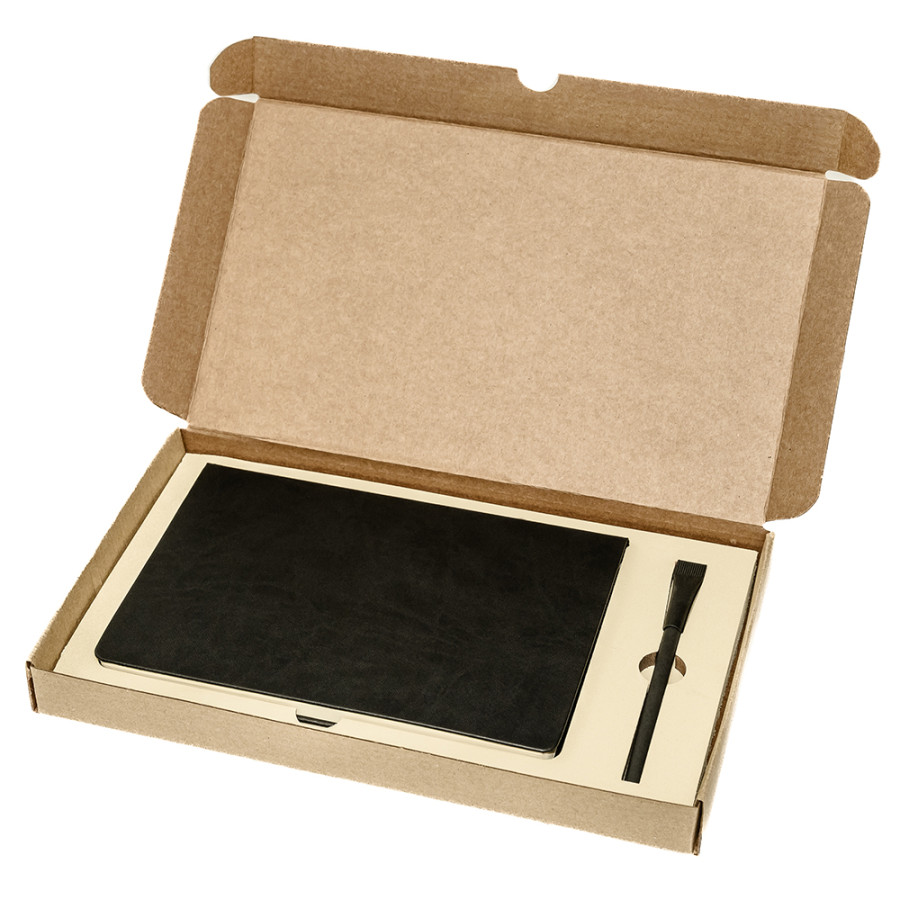Подарочный набор в стильной картонной коробке бежевого цвета. Внутри на аккуратном ложементе располагаются ежедневник недатированный в твердом переплете и картонная ручка с колпачком.