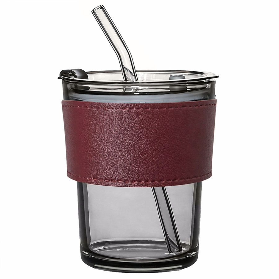 Стакан стеклянный с трубочкой и капхолдером Karamel, бордовый.