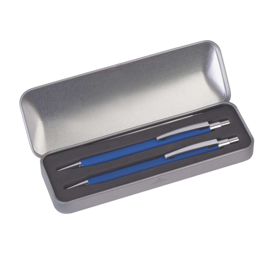 Металлическая ручка и карандаш с корпусом в покрытии soft touch в металлическом серебристом футляре.