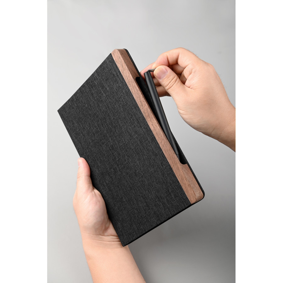 Невероятно оригинальная конструкция набора 2 в 1 - металлическая ручка скрыта и плотно держится в магнитном пенале из натурального дерева, закрепленном на обложке блокнота. При этом ручку легко извлечь, просто потянув за петельку на нажимной кнопке.