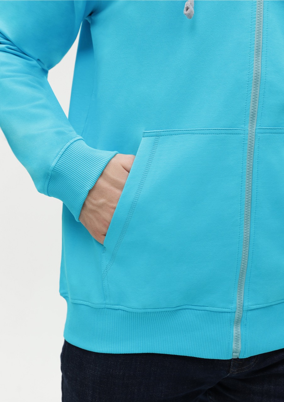 Мужская толстовка прямого силуэта с капюшоном комфортной глубины, рукавом-реглан, глубоким накладным карманом и застежкой на молнию контрастного цвета. Капюшон дополнен шнурком для регулирования прилегания, манжет и низ изделия оформлены широкой эластичной резинкой.