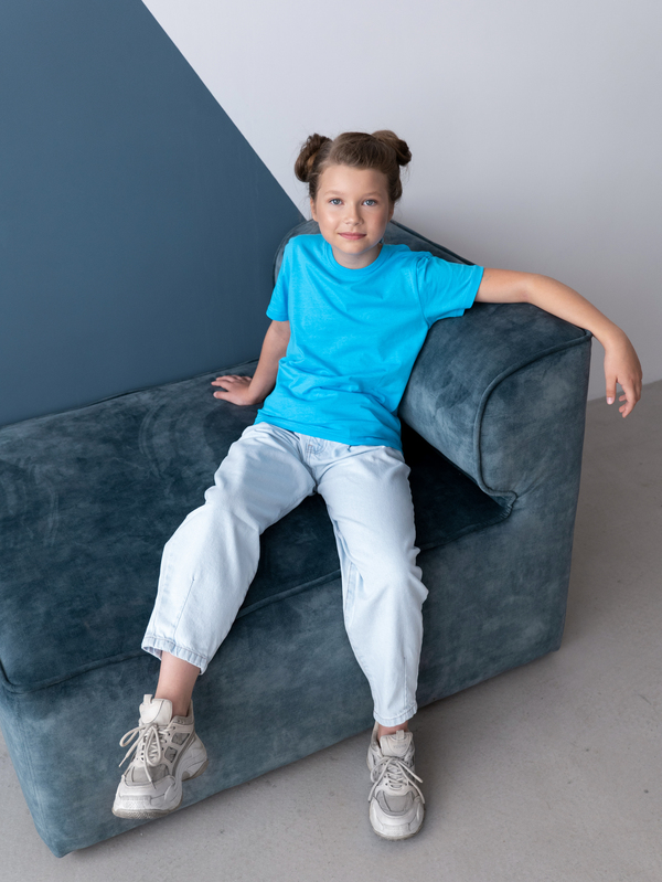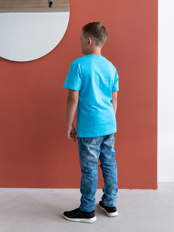 Детская футболка свободного силуэта с округлым воротом и втачным рукавом. Плечевые швы и шов горловины спинки усилены настрочной бейкой из основного полотна.