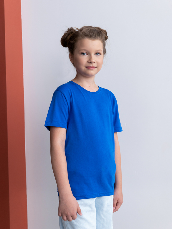 Детская футболка свободного силуэта с округлым воротом и втачным рукавом. Плечевые швы и шов горловины спинки усилены настрочной бейкой из основного полотна.