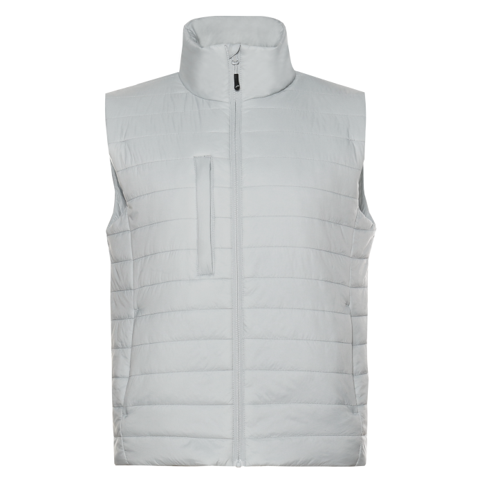Ультралегкий жилет прямого силуэта с горизонтальной стежкой, воротником-стойкой, функциональным карманом по правой полочке, прорезным карманом и застежкой на молнию с внутренней ветрозащитной планкой. В комплекте прилагается сумка-чехол (технологии нанесения: шелкотрансфер и DTF-печать).