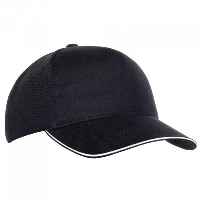 Пятиклиновый пошив, отсутствие лобового шва и изогнутый жесткий козырек «сэндвич» с контрастным кантом. Посадка регулируется ремешком с металлической застежкой.