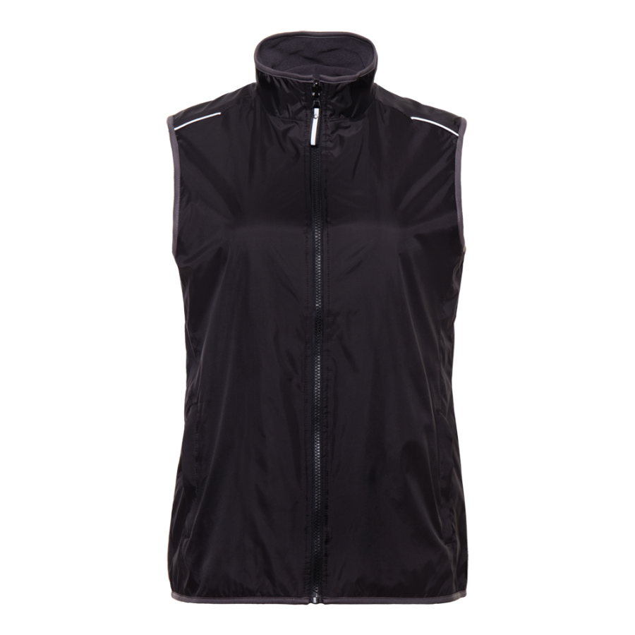 Женский жилет приталенного силуэта с воротником-стойкой, прорезным карманом и застежкой на молнию. Модель дополнена светоотражающими элементами на плечах, подвижной части застежки-молнии и по спинке изделия.