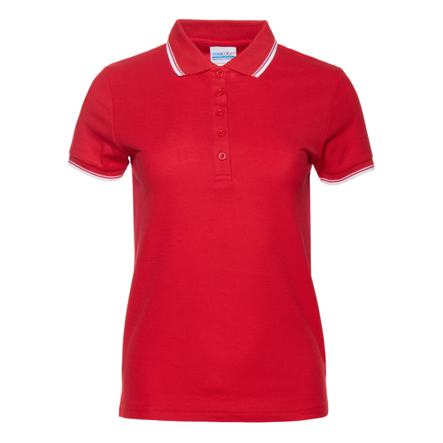 Женское поло приталенного силуэта с отложным воротником, втачным коротким рукавом и застежкой на пуговицы. Воротник и манжет выполнены контрастной резинкой.
