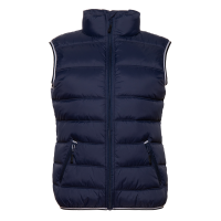 Женский жилет приталенного силуэта с геометричной стежкой, воротником-стойкой, прорезным карманом и застежкой на молнию. Изделие дополнено контрастной резинкой по пройме и линии низа для дополнительной защиты от холода и ветра.