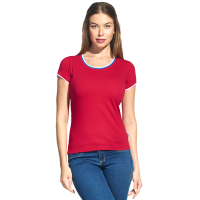 Женская футболка облегающего силуэта с округлым воротом и втачным рукавом с контрастным трикотажным манжетом. Воротник оформлен тесьмой в цвете «триколор».
