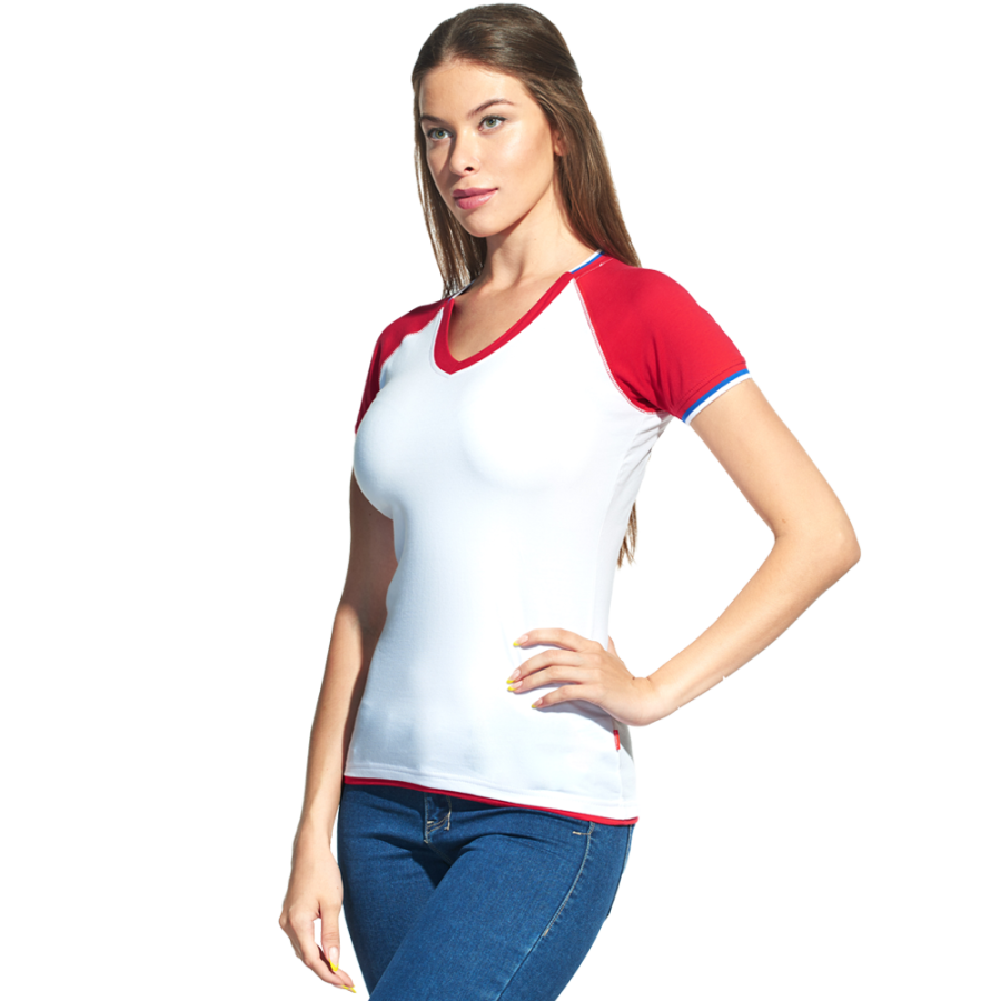 Женская спортивная футболка облегающего силуэта с V-образным воротом и рукавом-реглан с плотным трикотажным манжетом. Воротник и манжет оформлены тесьмой в цвете «триколор».