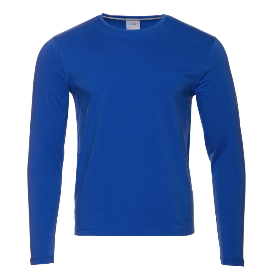Универсальная футболка прямого силуэта с округлым воротом и длинным втачным рукавом. Плечевые швы и шов горловины усилены настрочной бейкой из основного полотна.