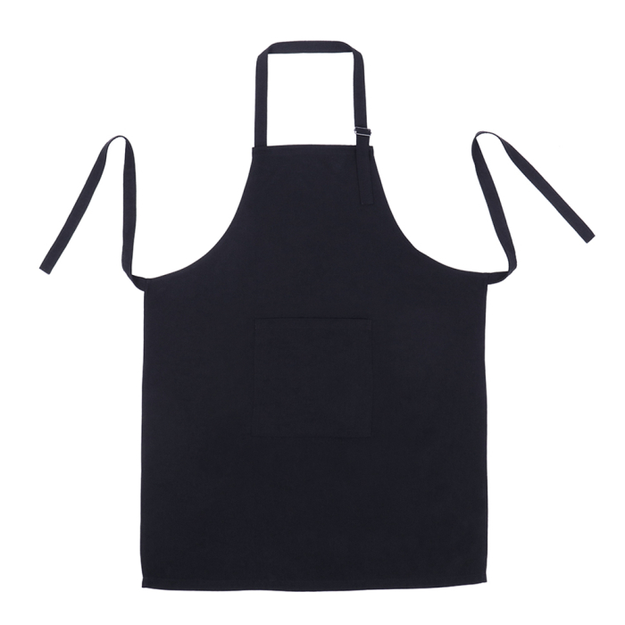 Фартук классического кроя с лямкой через шею, глубоким накладным карманом и поясом из двух частей.