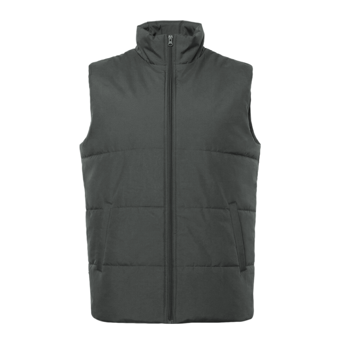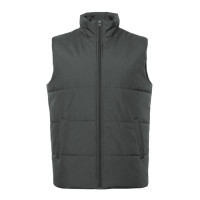 Утеплённый жилет полуприлегающего силуэта с воротником стойкой, центральной застежкой на молнию в тон основному полотну и прорезным карманом с листочкой. Подклад выполнен в цвет основного материала, утеплитель надежно зафиксирован прострочкой по груди и спинке.