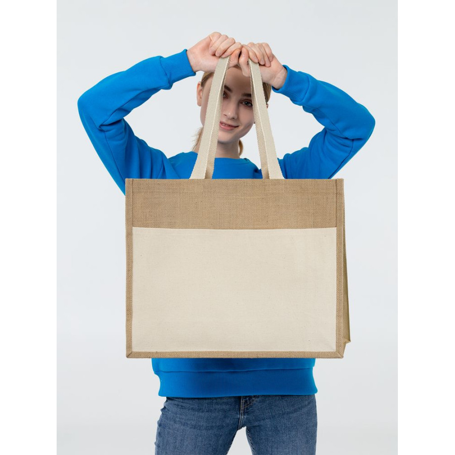 | Материал: | джут, плотность 240 г/м²; ручки, карман - хлопок 100%, плотность 280г/м² |