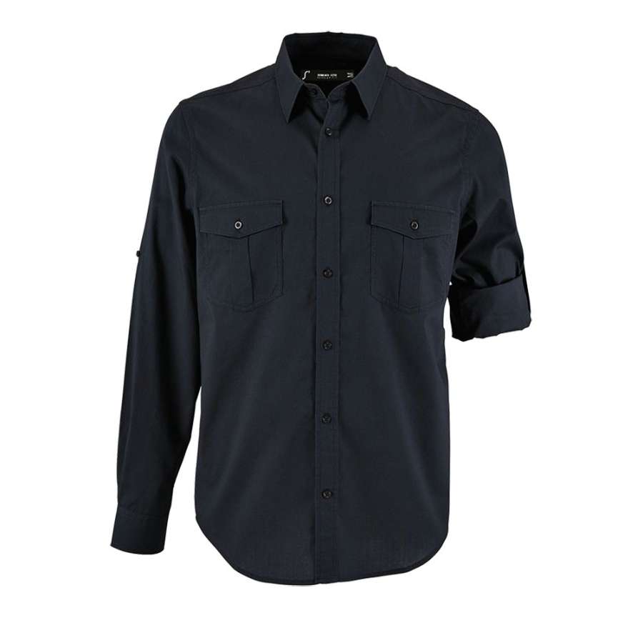 Рубашка прямого кроя в стиле «сафари» с планкой на 7 пуговиц в тон и манжетами на 1 пуговице.