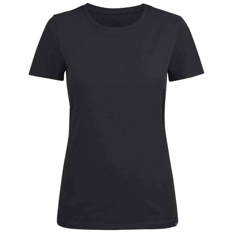 Женская футболка с круглым вырезом. Двухслойная резинка предохраняет воротник от деформации после стирки.