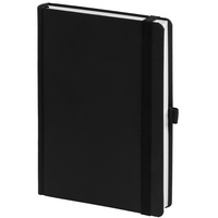 Ежедневник с твердой обложкой без поролона, выполнен из материала Soft Touch, черный АА, дополнен резинкой шириной 1 см, петлей-резинкой для ручки, капталом и ляссе черного цвета.