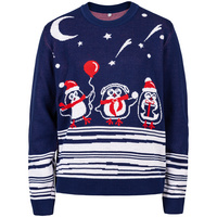 Пингвины отказались от неба, но зато покорили море. В их распоряжении почти целый континент и Южный полюс, а еще — сердца миллионов поклонников. Линейка Merry Fellow посвящена компании милых антарктических жителей: где-то неуклюжих и нерасторопных, а где-то — ловких и сообразительных. Дружные пингвины из коллекции создадут по-настоящему зимнее настроение, а еще напомнят, что нет ничего невозможного, если держаться друг за друга. Джемпер с круглым вырезом и жаккардовым рисунком.