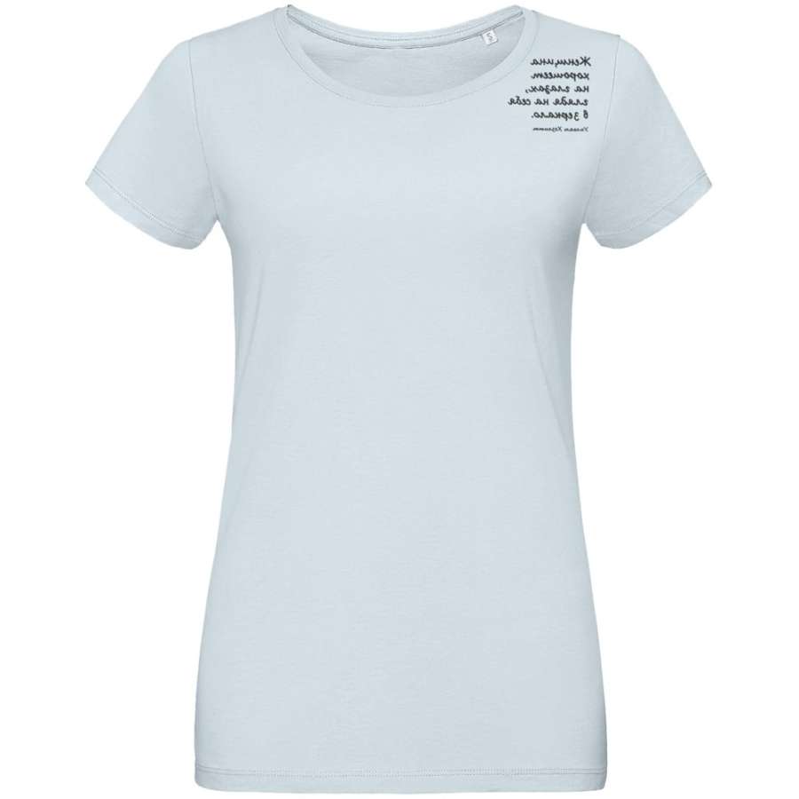 Цитата «Женщина хорошеет на глазах, глядя на себя в зеркало» отзеркалена, так что для окружающих она выглядит абракадаброй. Но стоит обладательнице футболки подойти к зеркалу, она увидит правильное написание. Тут и случится то самое волшебство, про которое написано на футболке.