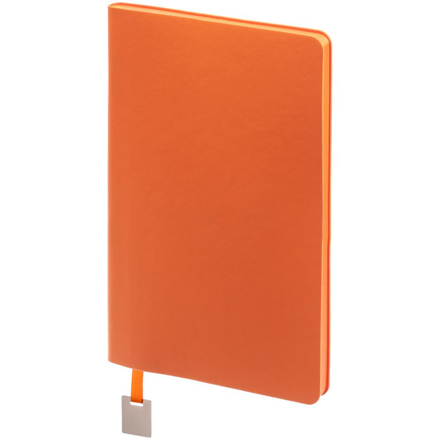 Ежедневник с гибкой обложкой, выполнен из материалов Soft Touch Pearl, оранжевый ОО, и Latte, оранжевый (внутренняя часть обложки), дополнен ляссе в цвет обложки с металлическим шильдиком.
