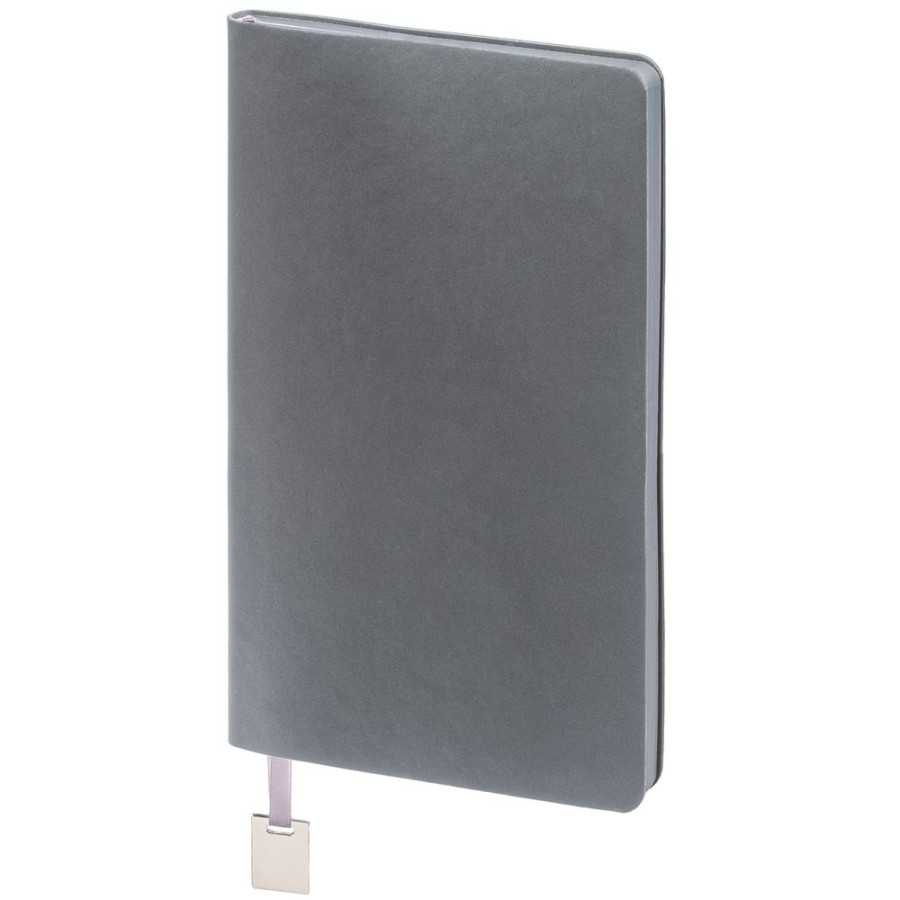 Ежедневник с гибкой обложкой, выполнен из материалов Soft Touch Pearl, серый СС, и Latte, серый (внутренняя часть обложки), дополнен ляссе в цвет обложки с металлическим шильдиком.