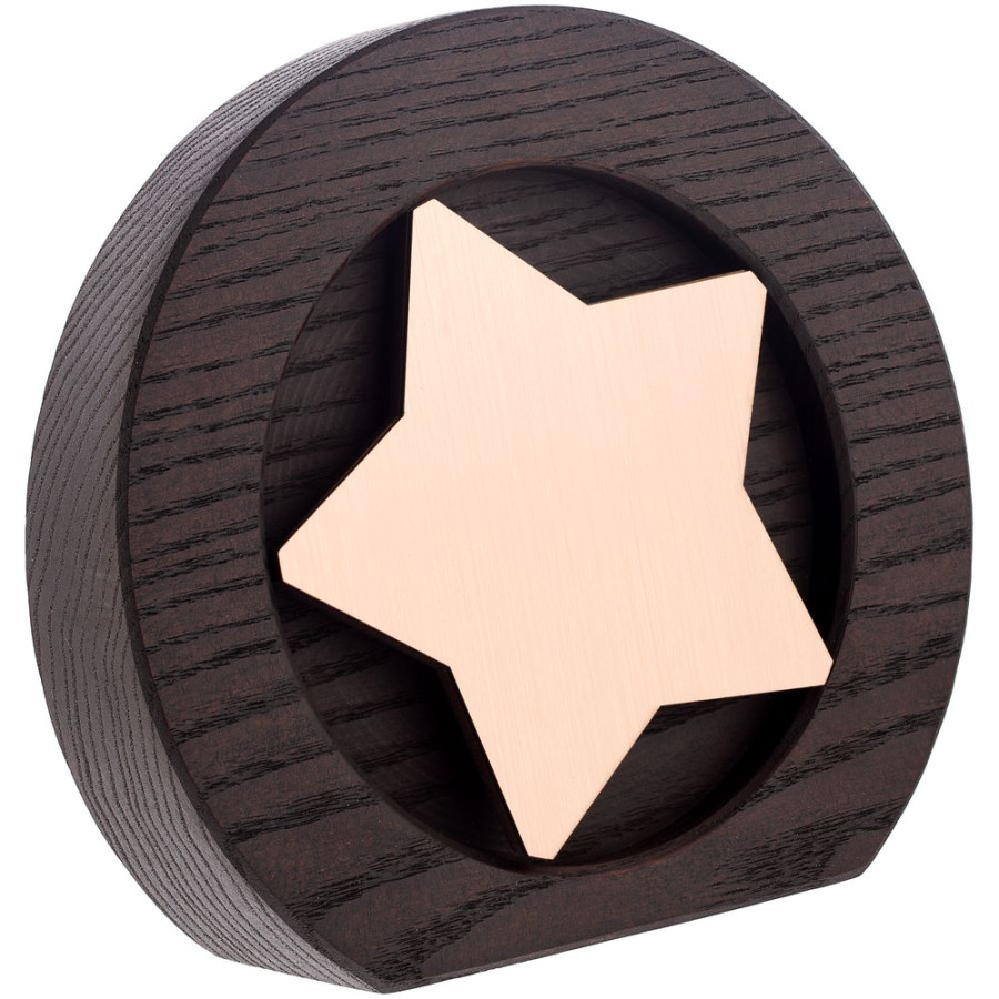 Вставка со звездой из зеркального пластика на деревянной основе крепится на приподнятое основание внутри стелы, что создает объем и многослойность награды. На вставке предусмотрен клеевой слой для крепления после нанесения.