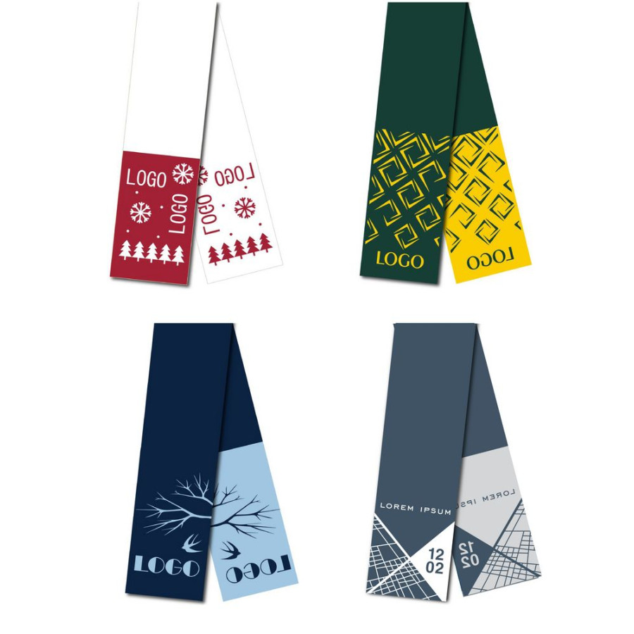 Шарф с вывязанным логотипом и/или индивидуальным рисунком в фирменной цветовой гамме.