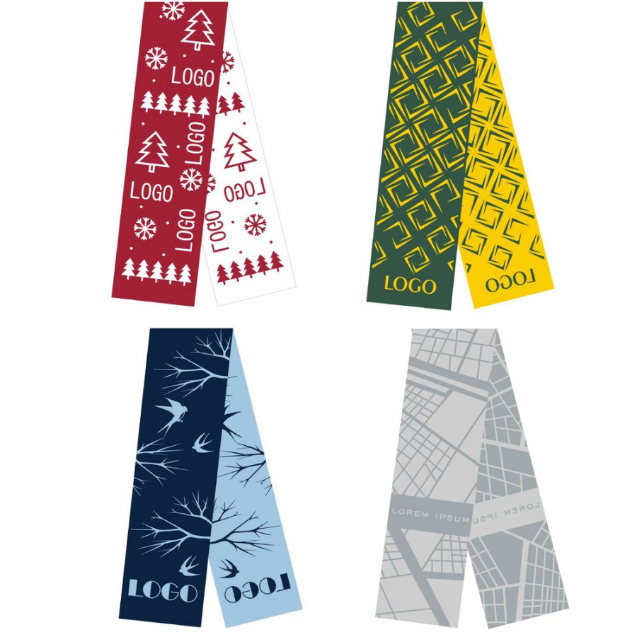 Шарф с вывязанным логотипом и индивидуальным рисунком в фирменной цветовой гамме.