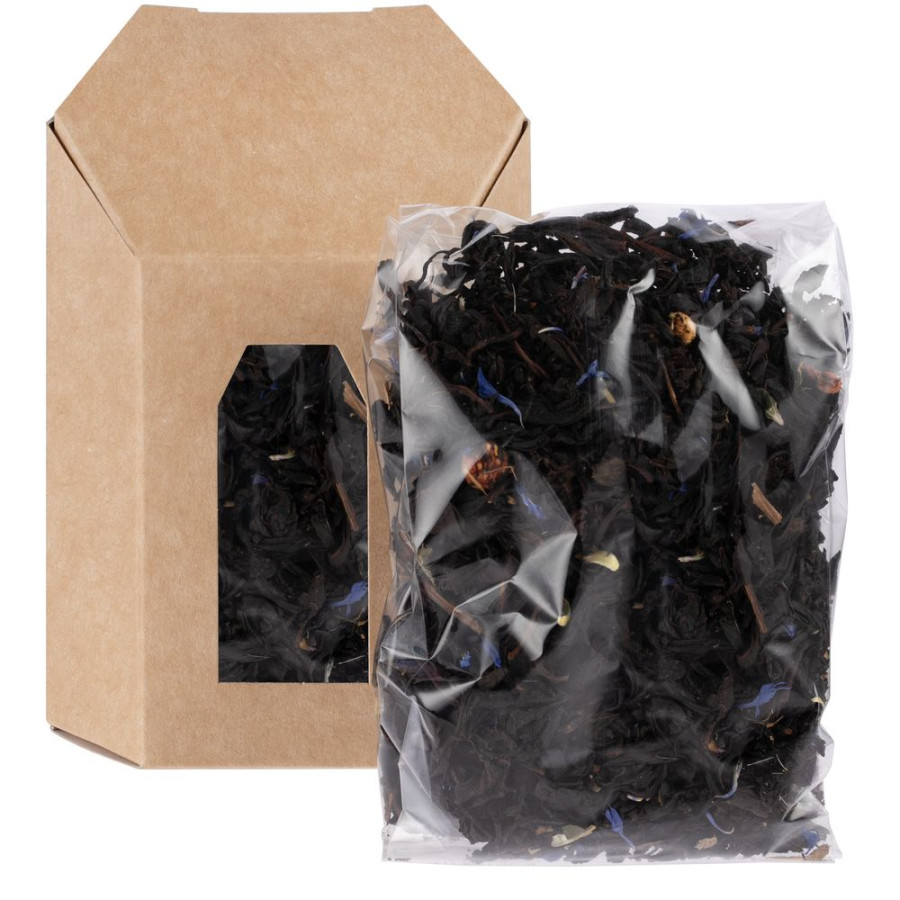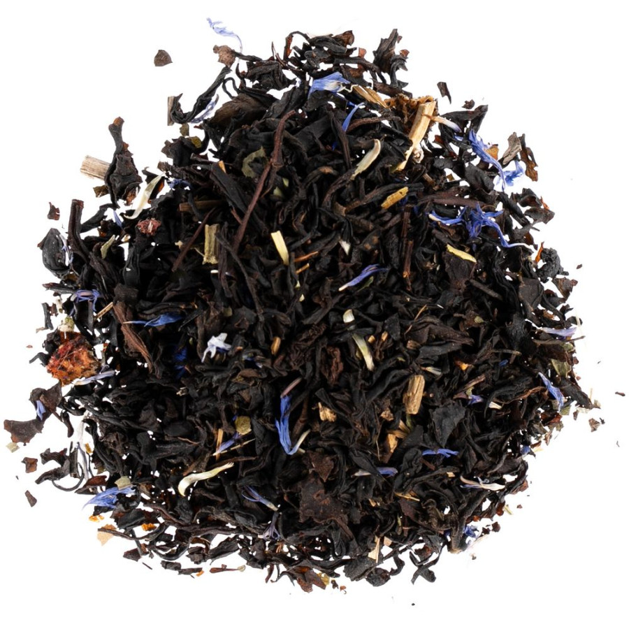 Праздничный купаж на основе черного чая, украшенный цветочными лепестками и кусочками клубники. Состав: черный индийский чай, сушеная клубника, клубничный лист, цветки василька, ароматизатор «клубника».