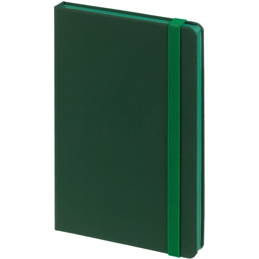 Блокнот в твердой обложке, выполнен из материала Soft Touch, зеленый FF, дополнен резинкой и ляссе в цвет обложки.