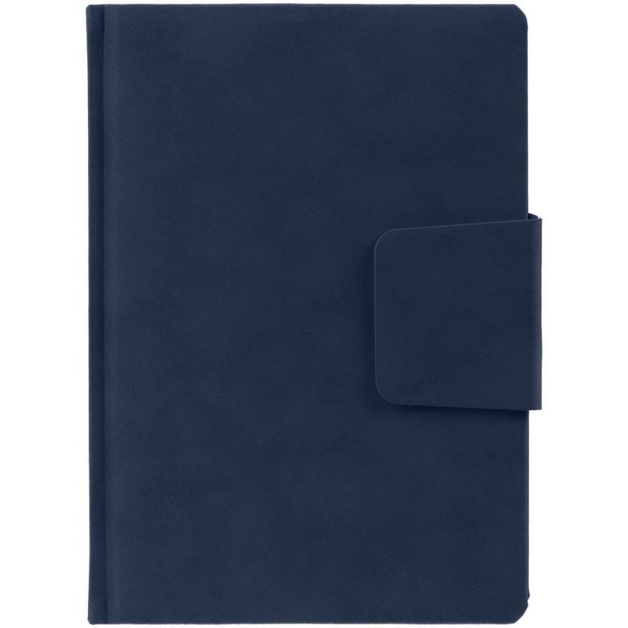 Ежедневник с твердой обложкой c поролоном, выполнен из материала Nubuck, темно-синий ХХ, дополнен капталом и ляссе темно-синего цвета. Застежка — хлястик на магните.