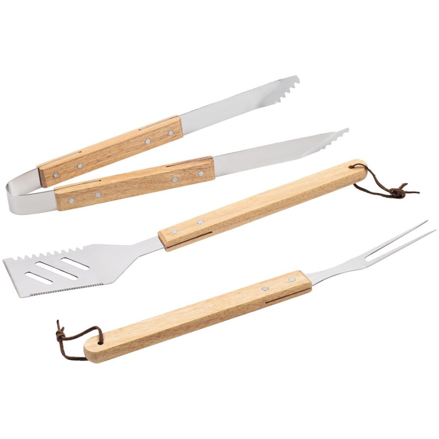 С надежными инструментами для барбекю No Misteak не грозит столкнуться с какой-либо ошибкой в приготовлении мяса — с ними удобно управляться, а значит, и еда получается вкуснее. Деревянные ручки не нагреваются — и на них хорошо ложится гравировка, а прочный полированный металл легко моется и не деформируется при работе с горячими продуктами и поверхностями. В набор входят: щипцы, вилка и лопатка.