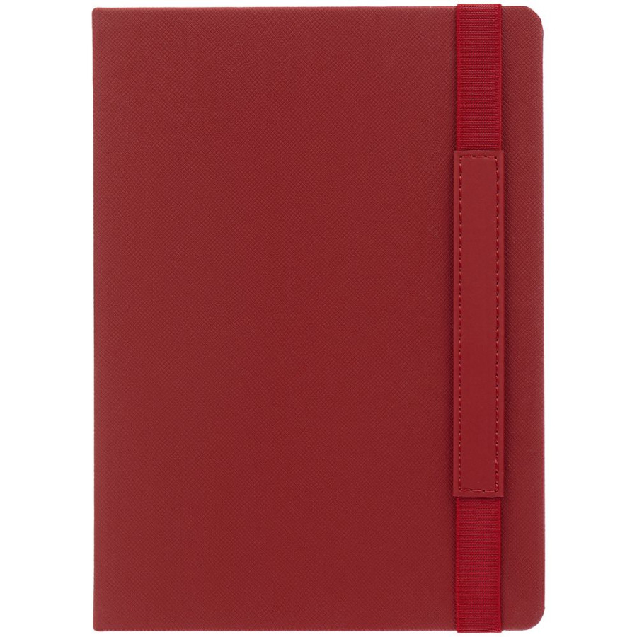 Ежедневник с твердой обложкой, выполнен из материала Nice Touch, красный РР, дополнен резинкой с лейблом из материала Soft Touch и ляссе в цвет обложки.