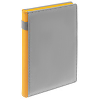 Твердая обложка с поролоном, материал обложки — Soft Touch, серый СС и Soft Touch, желтый КК. На корешке ежедневника находится петля из резинки.